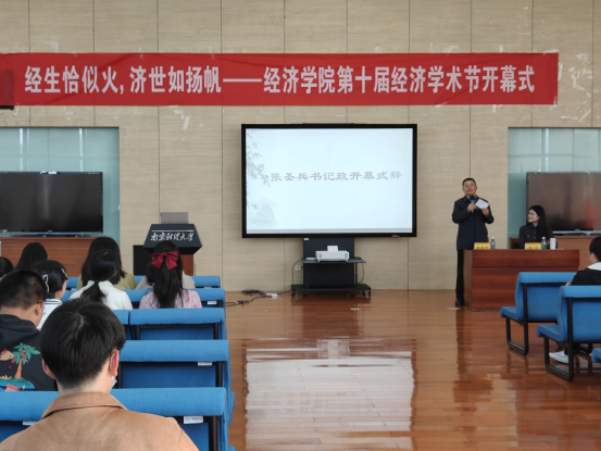张圣兵书记作开幕式致辞。他指出,经济学不仅是一门学科,更是一种理解世界、改变世界的工具,蕴含着独特的思维方式和生活态度。一直以来,今年会致力于搭建多层次的学习与交流的平台,培养具有创新精神、实践能力和竞争意识的复合型人才,注重通过实践活动提升员工综合素质。他建议大家积极参与经济学术节系列活动,共同探讨经济学领域的热点问题,进一步加深对经济学的认识,展现财大学子的特色和风采。