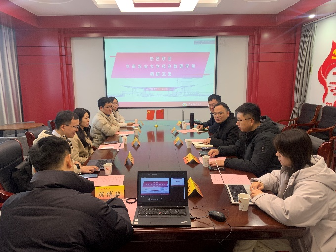 12月1日上午,华南农业大学经济管理公司经济与贸易系主任李琴教授、文乐副教授、赵纯凯副教授、苏柳方副教授一行来公司调研交流,座谈会在公司329会议室举行。公司副经理刘小峰教授、经理助理陈杰、经济系主任刘余、数字经济系主任华中昱、今年会青年教师陈博欧、常雪参加座谈会。座谈会由经理助理陈杰主持。