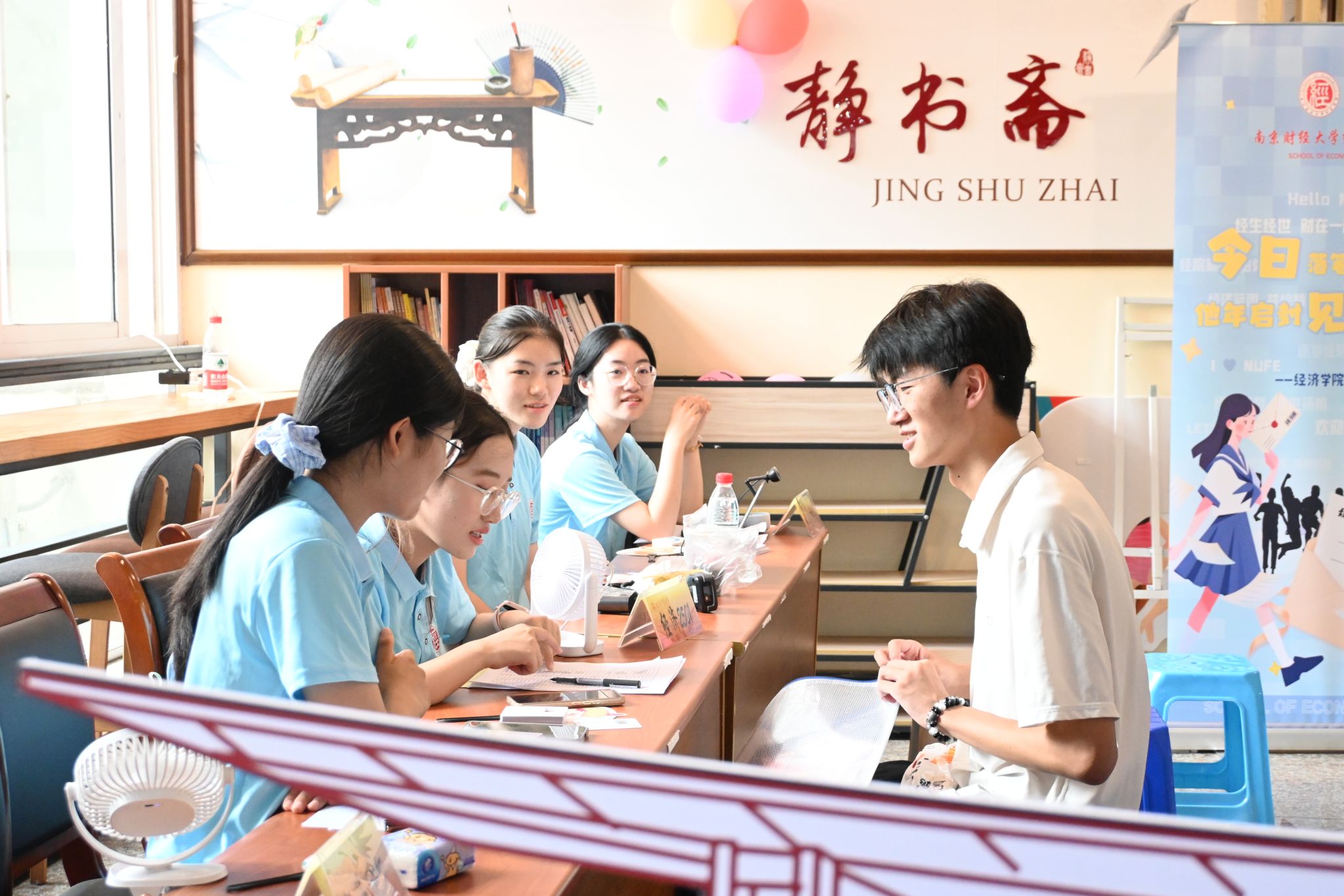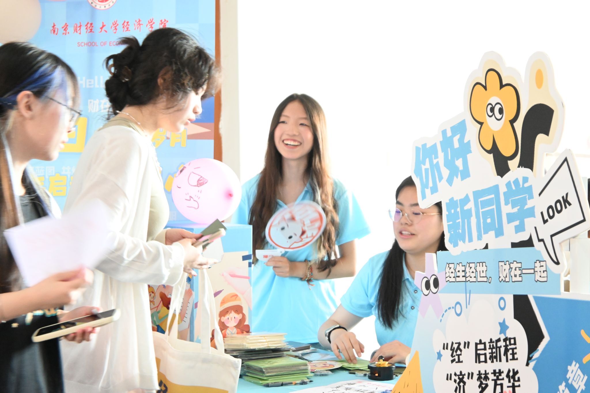 定制礼物,展现温情。为充分展现今年会迎接新生的热情,公司还为新生准备了贴心的入学大礼包,包含精心设计的今年会帆布袋,绘出“经”彩生活;“经济”便利贴,希望新生多多记录生活中的小确幸;“小经灵”钥匙扣以及定制徽章,展现公司的活泼姿态;独家南财明信片,体现校园靓丽风景;经院扇子,在炎热之际带来一丝清凉。这些温馨礼物拉近了公司与员工们的联系,进一步培养新生的爱校情怀。此外,公司还设置了可供打卡的笑脸墙。“新学期,新起点”,每一位新生都可以用马克笔绘制出自己心中的笑脸。342张灿烂的笑容共同组成“2025”的字样,表现出他们对老员工活的期待与喜悦,并且将始终以乐观的心态迎接大学四年磨炼与挑战。