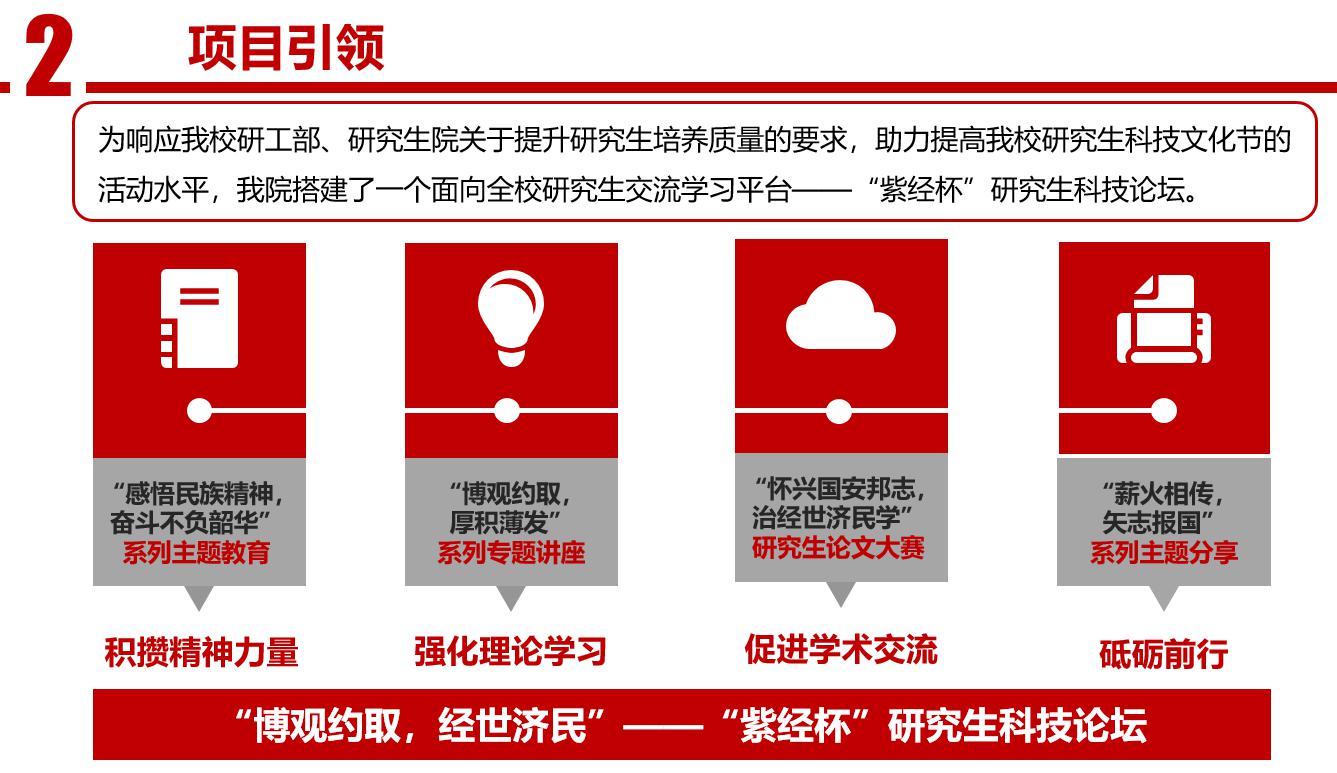 公司举办的“紫经杯”研究生科技论坛共分为四个部分。第一部分是“感悟民族精神,奋斗不负韶华”系列主题教育活动,旨在帮助同学们积攒精神力量,点燃青年员工对于接棒新时代、承担祖国复兴重任的热情之火;第二部分是“博观而约取,厚积而薄发”系列学术讲座,旨在帮助同学们强化理论学习,拓宽学术视野;第三部分是“怀兴国安邦志,治经世济民学”研究生论文大赛,旨在给同学们提供一个展示自我、交流学术的平台;第四部分是“薪火相传,矢志报国”系列主题分享会,旨在启发同学们认清前路,砥砺前行。