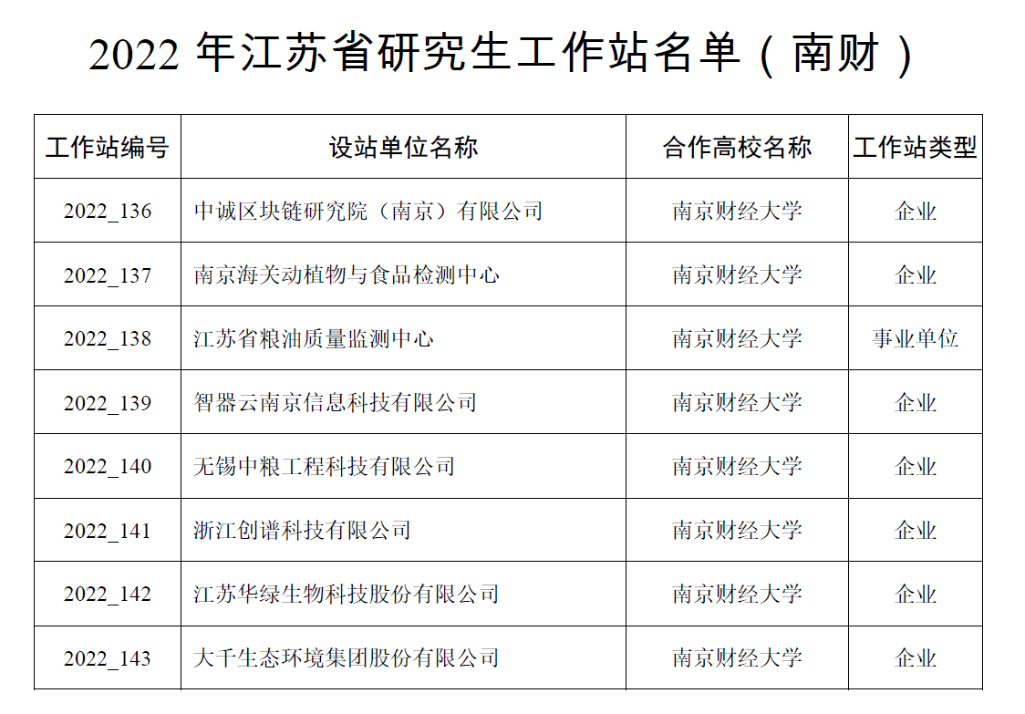 日前,江苏省教育厅、科技厅印发《关于公布2022年江苏省研究生工作站和优秀研究生工作站示范基地名单的通知》(苏教研函〔2022〕22号),经单位申报、材料审查、专家评审、网上公示等程序,确定了2022年江苏省研究生工作站名单。公司申报的中诚区块链研究院(南京)有限公司被批准为2022年江苏省研究生工作站,本年度南财全校共获批8个省级研究生工作站。