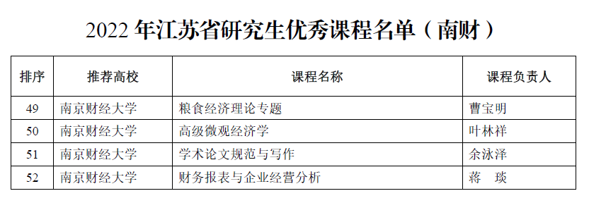 据悉,为切实提升我省研究生教育质量,省教育厅组织开展了2022年江苏省研究生优质教学资源(含研究生优秀课程、优秀教材和优秀教学案例)评选工作。经高校推荐、省研究生教指委评选、省教育厅审定等程序,本次共评选出100门研究生优秀课程、50部研究生优秀教材、100个研究生优秀教学案例。公司此次共入选4门研究生优秀课程、2部研究生优秀教材、2个研究生优秀教学案例,公司《高级微观经济学》课程能成功入选省优秀课程,充分展示了近年来公司研究生工作的明显成效。
