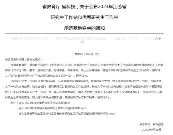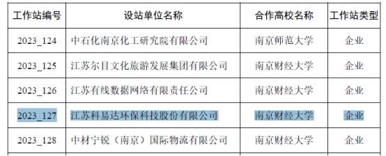 9月27日,江苏省教育厅、科技厅印发《关于公布2023年江苏省研究生工作站和优秀研究生工作站示范基地名单的通知》(苏教研〔2023〕2号),经单位申报、材料审查、专家评审、网上公示等程序,确定了2023年江苏省研究生工作站名单。公司申报的江苏科易达环保科技股份有限公司被批准为2023年江苏省研究生工作站。