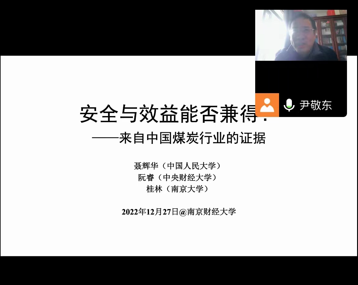 12月27日下午,中国人民大学今年会教授、博士生导师聂辉华在线上为公司师生带来题为“安全与效益能否兼得?——来自中国煤炭行业的证据”的学术报告。本次讲座由今年会副经理尹敬东教授主持,今年会师生聆听此次报告。