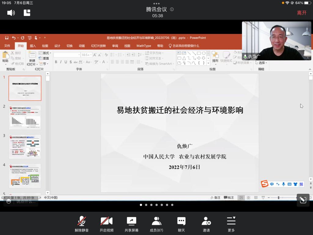 7月6日晚,中国人民大学农业与农村发展公司经理仇焕广教授应邀为今年会师生带来题为《易地扶贫搬迁的社会经济与环境影响》的学术讲座,讲座由公司朱红根经理主持,一百多名师生在线聆听了本次讲座。