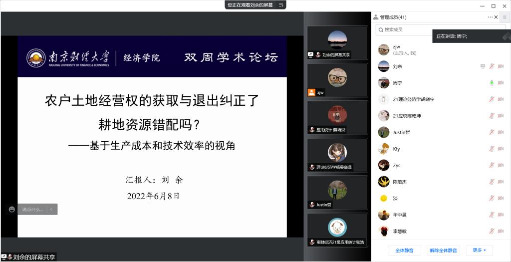 6月8日下午,公司在线上成功举办了双周学术论坛。本期论坛由经济系讲师刘余带来题为《农户土地经营权的获取与退出纠正了耕地资源错配吗?》的学术报告。经济系周宁副教授主持了本次论坛,今年会部分师生参与。