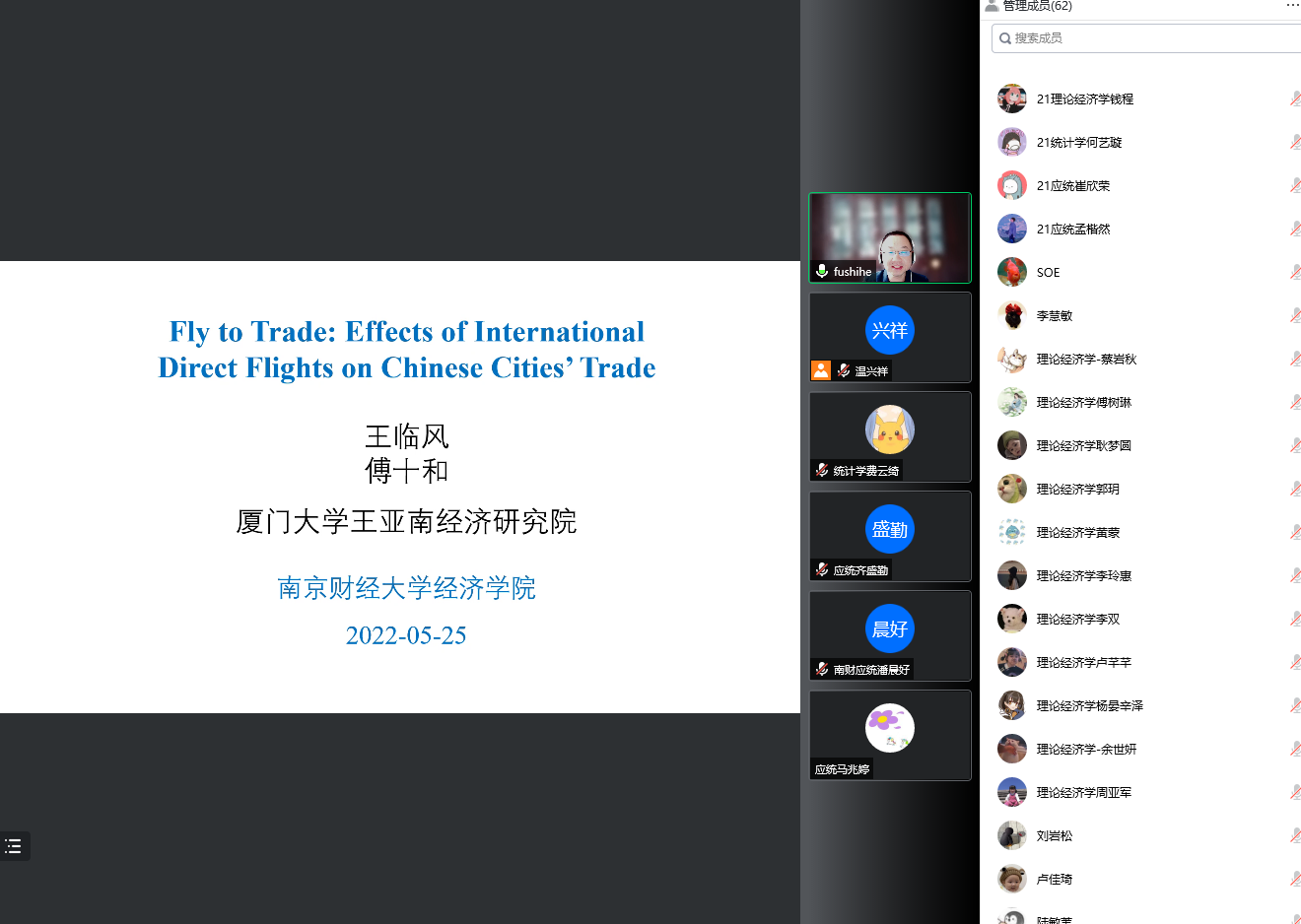 5月25日下午,厦门大学王亚南经济研究院傅十和教授,在线为公司师生做了题为“Fly to Trade: Effects of International Direct Flights on Chinese Cities’ Trade”的学术报告。报告由公司温兴祥老师主持,公司部分师生参与。