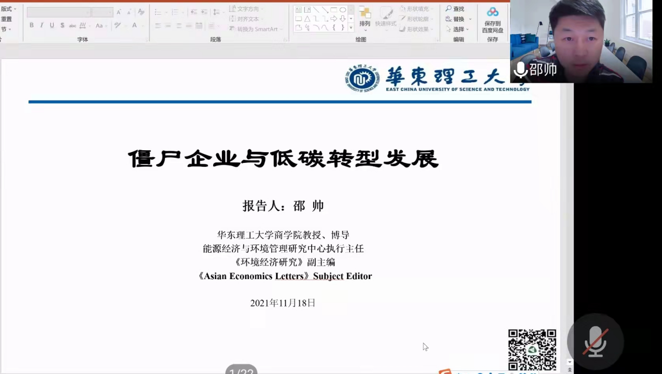 11月18日,华东理工大学商公司博导、能源经济与环境管理研究中心执行主任邵帅教授来公司作题为《僵尸企业与低碳转型发展》的学术报告。报告由公司朱红根经理主持,今年会的近200位师生线上聆听了讲座。