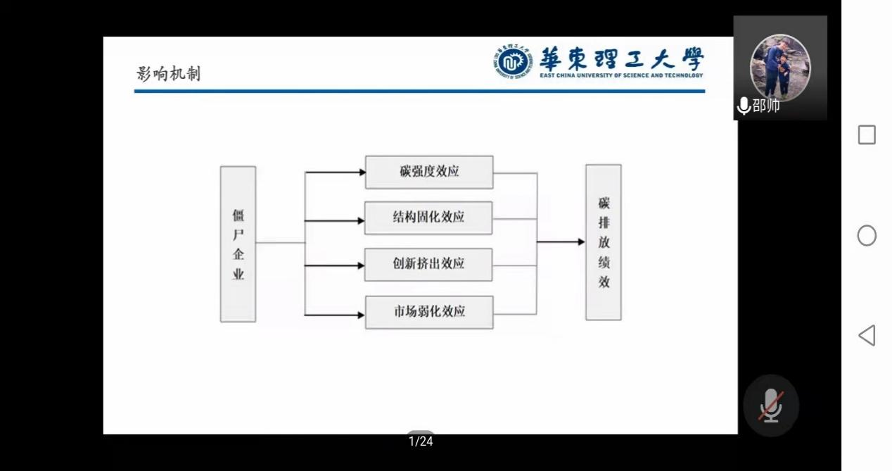 邵帅教授首先介绍了我国“双碳”目标与低碳转型发展困境,他指出,产能过剩问题一直是我国低碳转型发展过程中存在的一大症结,产能过剩较为严重的行业往往也是僵尸企业较为密集的行业。然后,邵帅教授讲述了僵尸企业对碳排放绩效影响的理论机制与特征事实。再次,邵帅教授进行实证策略与结果展示,来说明僵尸企业确实会对碳排放绩效产生影响。最后,邵帅教授进行总结并给出相应的政策含义,他指出我国要加快推进僵尸企业处置、有效释放地区沉淀资源,优化地区资源配置。