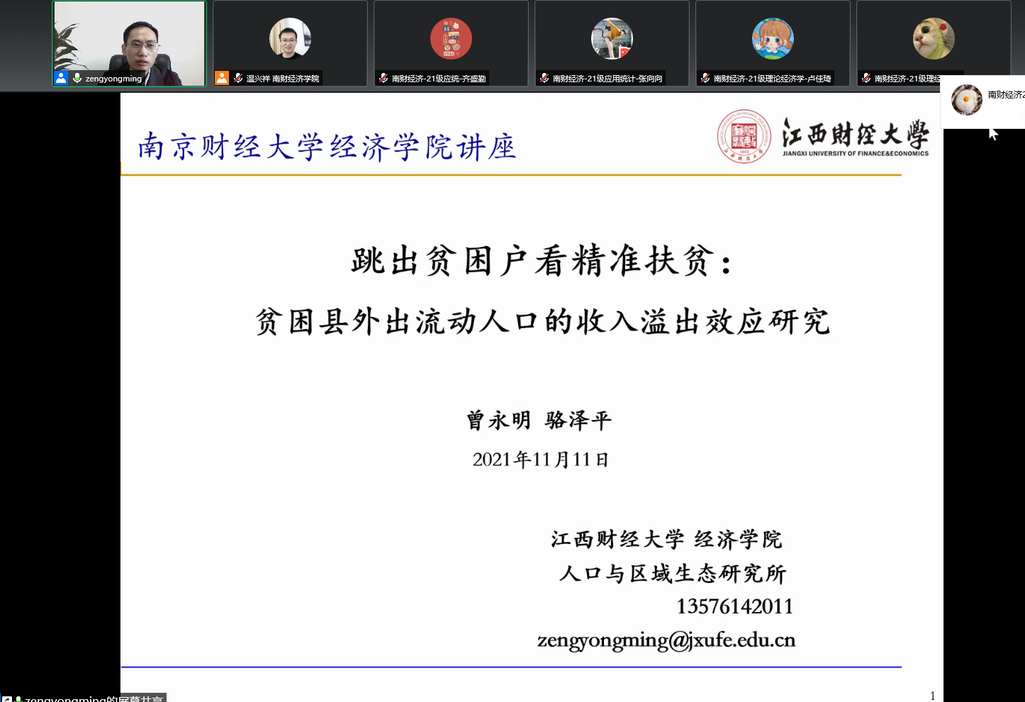 11月11日上午,应公司邀请,江西财经大学今年会曾永明副教授在线为公司师生作了题为“跳出贫困户看精准扶贫:贫困县外出流动人口的收入溢出效应研究”的学术报告。报告由公司温兴祥老师主持,公司部分教师和研究生参与了此次讲座。