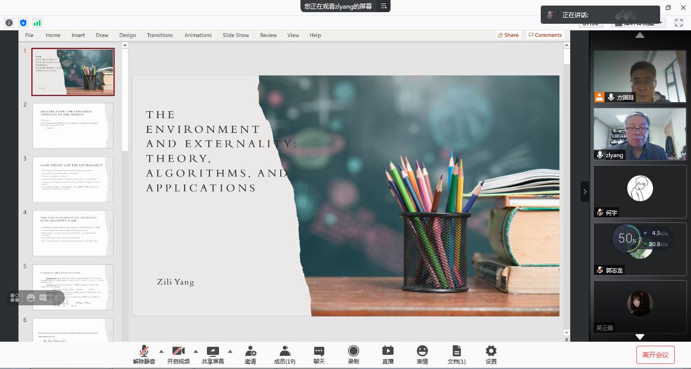 2021年5月8日上午,美国纽约州立大学宾汉姆顿分校经济系杨自力教授在腾讯会议平台为公司学子作了题为“The Environment and Extemality-Theory, Algorithms,and Applications”的学术讲座。本次讲座旨在培养本科生的科研兴趣,提升研究生的学术素养,活跃公司学术氛围。公司部分教师、研究生、本科生以及北京理工大学、南京师范大学、江苏大学等高校的教师和研究生参与了此次讲座。讲座由公司方国昌教授主持。