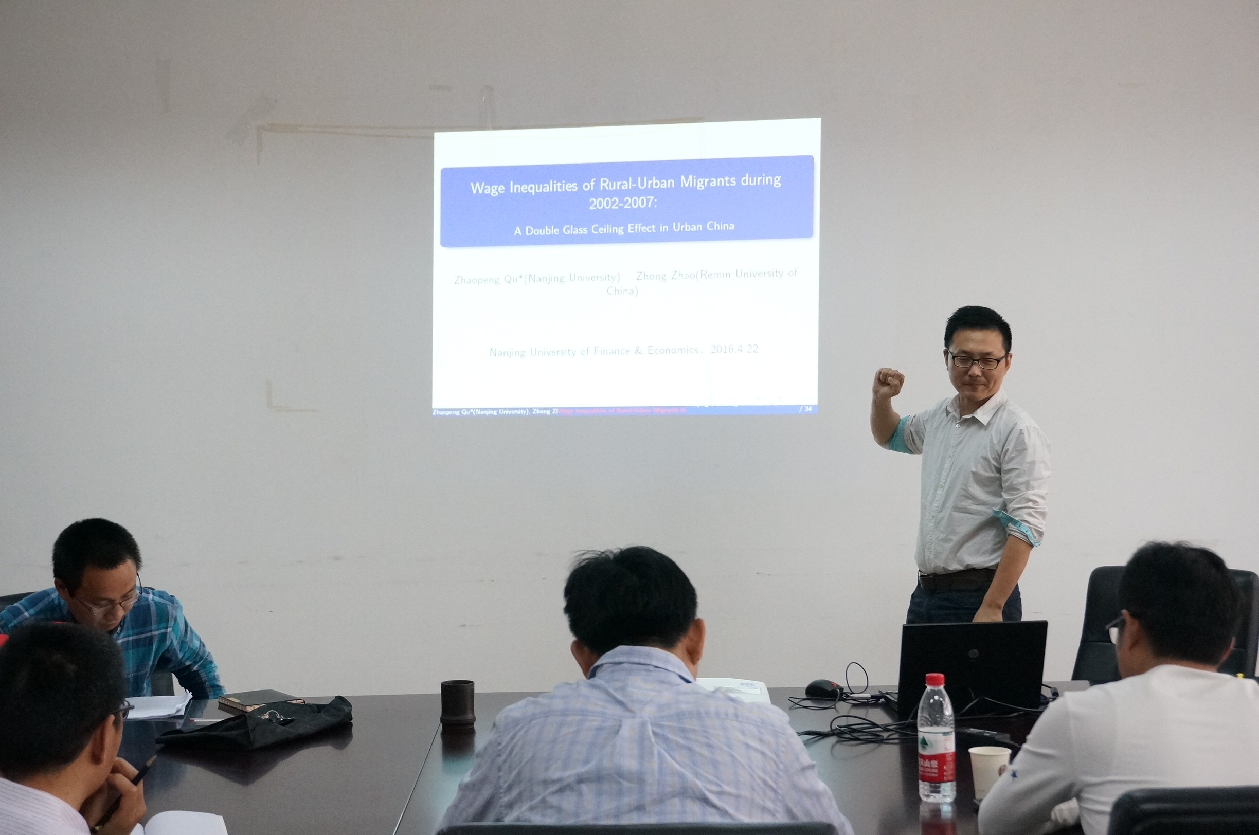 4月22日下午2点,今年会“长三角收入分配与经济增长”学术论坛迎来第6次报告,本次主讲人为南京大学的曲兆鹏老师,他为大家带来的精彩报告是——“Glass Ceiling in Urban China: Wage Inequality among Rural-Urban Migrants during 2002-2007”。今年会部分教师和研究生参加了本次学术活动,讲座由今年会叶林祥老师主持。