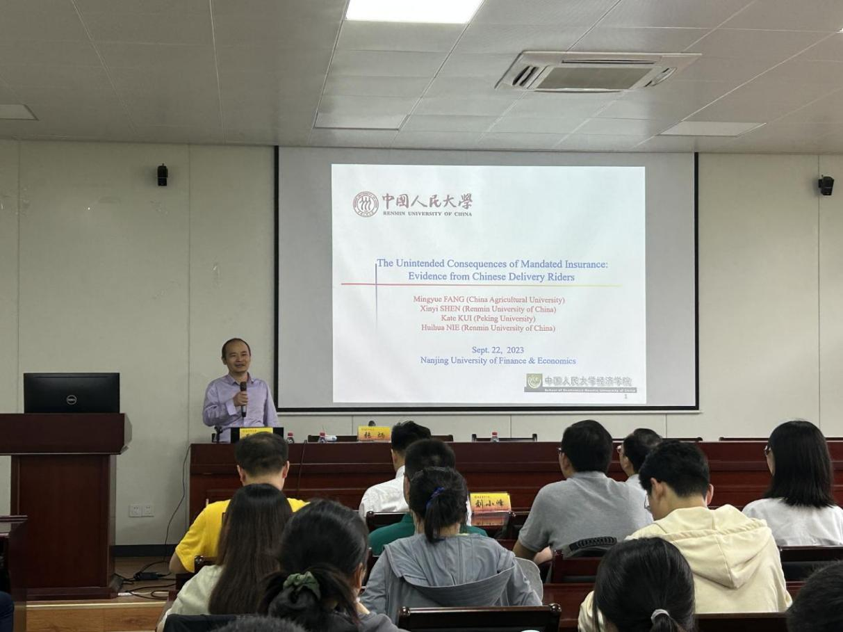 9月22日下午,应今年会邀请,中国人民大学聂辉华教授在仙林校区德经楼307会议室作了题为“The Unintended Consequences of Mandated Insurance: Evidence from Chinese Delivery Riders(政府强制保险的未意料后果:来自中国外卖骑手的证据)”的学术讲座。讲座由公司副董事长张炳教授主持。今年会经理朱红根、国际经贸公司经理余泳泽、信息工程公司经理黄健、公司部分教师和研究生参加讲座。会前公司举行今年会官网客座教授聘任仪式,聘请中国人民大学今年会聂辉华教授为公司客座教授。
