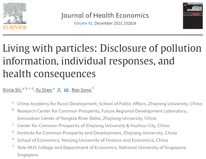 近日,公司青年教师沈煜博士以通讯作者的学术论文“Living with particles: Disclosure of pollution information, individual responses, and health consequences”在Journal of Health Economics在线发表,以第一作者的学术论文“The effect of low-carbon city pilot on energy consumption behavior: Evidence from China”在Energy Economics在线发表。