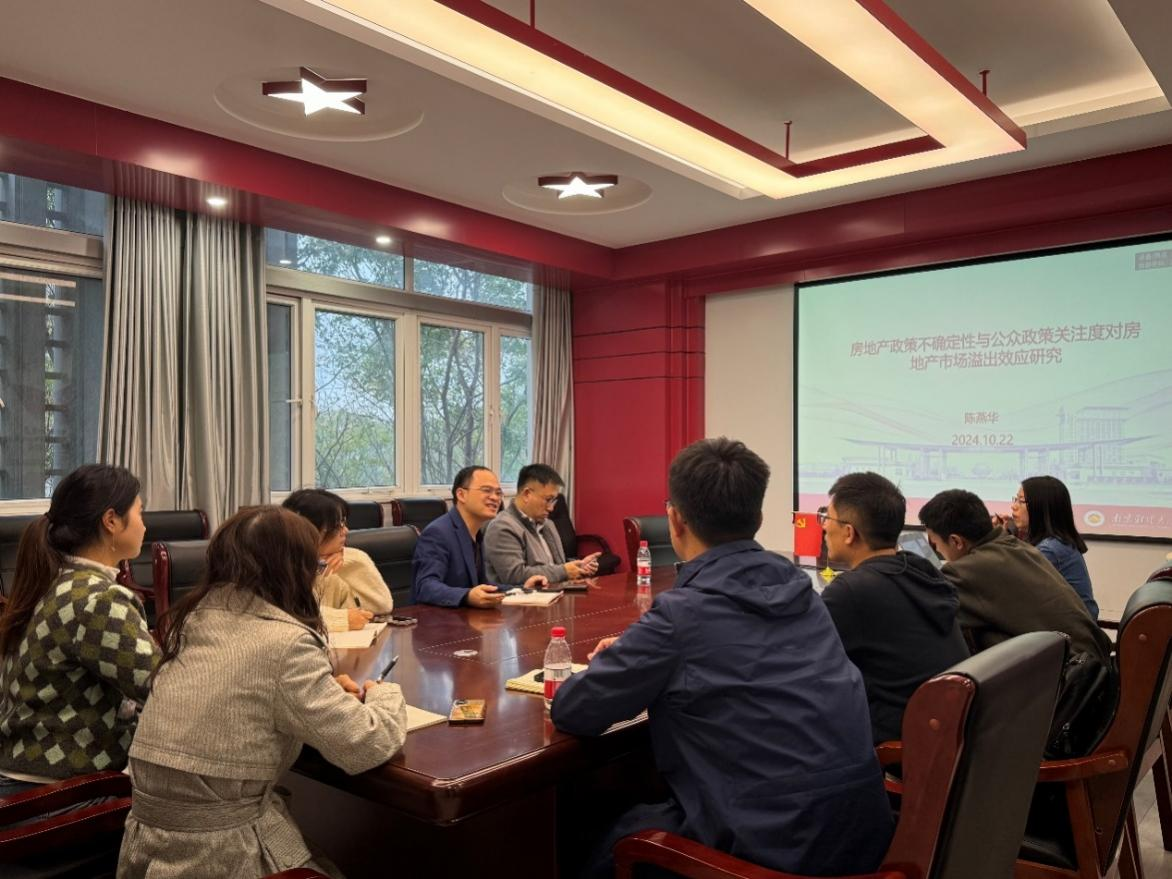 10月22日下午,公司在德经楼会议室329举办了双周学术论坛。本期论坛由陈燕华老师带来主题为“房地产政策不确定性与公众政策关注度对房地产市场溢出效应研究”的学术交流。陈杰副教授主持了本次学术论坛,公司部分教师参与。